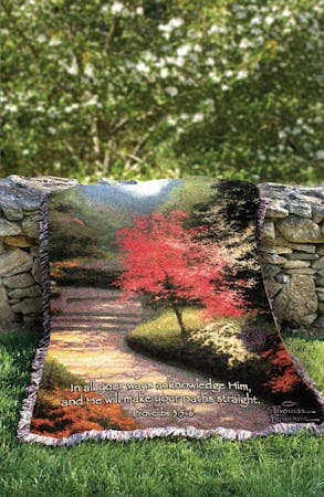 Sunlight scattered across a stone path leads the eyes to the brilliant blossom of a dogwood tree, the quintessential symbol of spring and rebirth. On the search for new inspiration, Thomas Kinkade discovered a flawless scene celebrating the splendor of springtime rendered upon this magnificent tapestry throw with verse. Size: 51" x 68"
