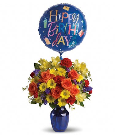 For a birthday bursting with excitement, you can't beat this explosion of color, featuring carnations, roses and so much more. All topped off with a colorful mylar balloon.