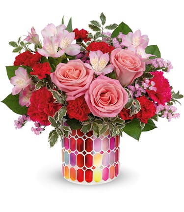 Charmed, I'm sure! Sweep her off her feet with this lovely bouquet of pink blooms presented in a magnificent mosaic vase of pearlescent stained glass.