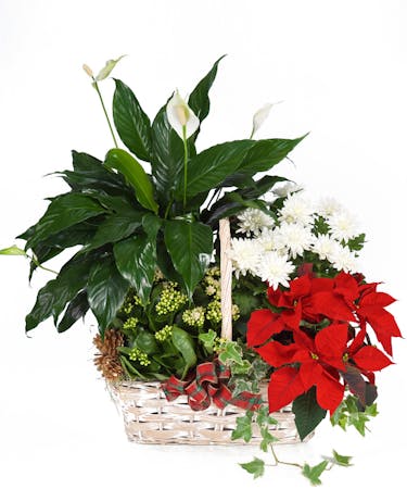 The Christmas Garden Basket is a splendid fusion of nature's beauty and the festive spirit of the holiday season. It's as if a slice of a serene winter garden was tucked neatly into a basket, ready to bring joy and warmth to any space. The striking poinsettias, with their vibrant red leaves, stand out as nature's very own Christmas ornaments, and they're a symbol of the season recognized universally. Their vivid hue creates a lovely contrast with the pure white chrysanthemums, which bring to mind a gentle snowfall or the soft glow of winter moonlight. The peace lilies rise elegantly, their white spathes like serene stars against the night's canvas, adding a touch of tranquility and purity to the arrangement. Interspersed with these blooming wonders are evergreens and pinecones, evoking the refreshing scent of a winter forest. The basket, adorned with a festive plaid ribbon, provides a rustic charm that complements the plants within. What makes this basket truly special is its lasting appeal.