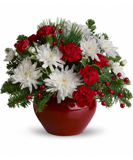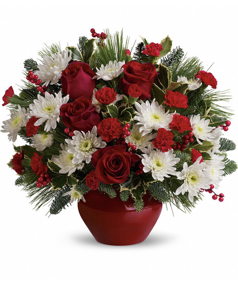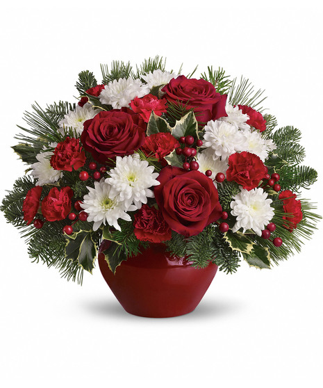 Treasure the beauty of fresh Christmas flowers. Send this traditional mix of red and white blossoms and fragrant evergreens to a favorite friend or family member, and celebrate the spirit of the season.