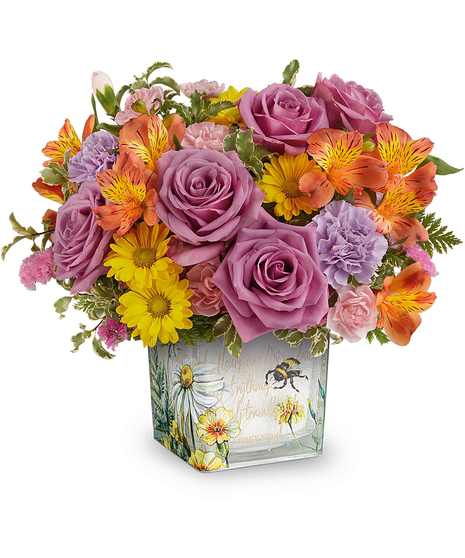 Like a bee dancing through a hidden garden, this enchanting bouquet of orange, lavender, and yellow blooms in a vintage-inspired glass cube makes for a truly magical gift.