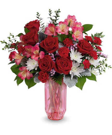 Celebrate love's radiant hues with our Gorgeous Gem Bouquet, a stunning Valentine's Day mix of red and pink blooms in a shimmering faceted pink glass vase that sparkles with modern romance.