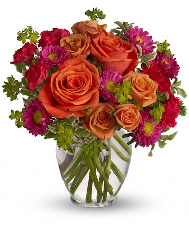 Seeking out a fine bouquet that’s darling and delightful? This charming mix of fresh blooms in ripe, fruity shades of raspberry, peach and cherry is a tempting pick-me-up for any day of the week. Send one to a favorite friend to brighten up their day.