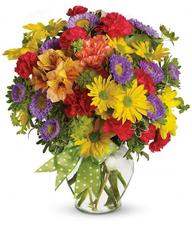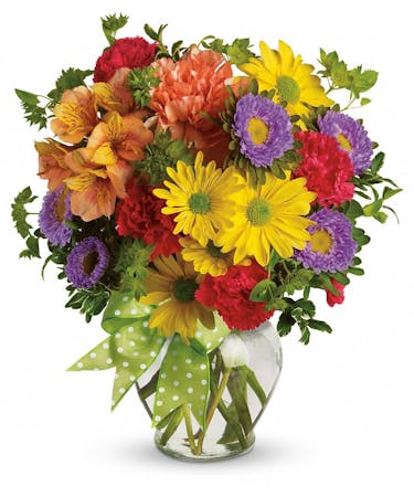 All their wishes will come true when they receive this bright and sunny flower arrangement – a summery mix of yellow daisy chrysanthemums, purple asters, hot pink and orange carnations and more, adorned with a cheerful yellow plaid bow. Send one today, and make someone’s day!