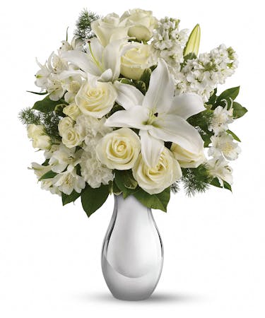 So simple, and so breathtakingly beautiful. This holiday flower arrangement features an all-white bouquet of roses, lilies and more in an exquisite silver reflections vase that will be cherished for years. Perfect for Christmas, Hanukkah - or just because.