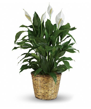 This floor-sized plant with its shiny dark green leaves produces striking white lily-like flowers all year. Perfect for home or office.