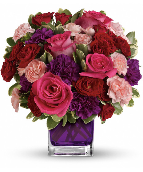 Pure romance. Hot pink roses and dark red spray roses are brightly arranged inside our violet cube.