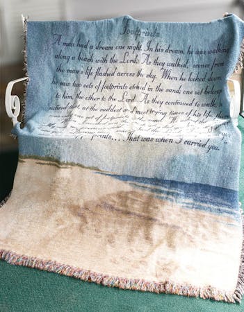Words that inspire and lift you are the centerpiece in this throw of "Footprints in the Sand." The scene of one set of footprints on a beach emphasizes the meaning of this classic story of the Lord's support when we are unable to support ourselves. Beautifully woven, this throw will soon become one of your favorite pieces. Size: 51" x 68"