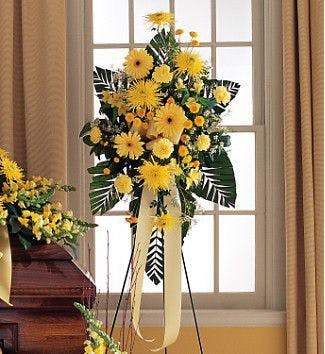 Eloquently express your sympathy with this stunning floral arrangement of yellow alstroemeria, carnations, chrysanthemums and gerberas. Same-day delivery.